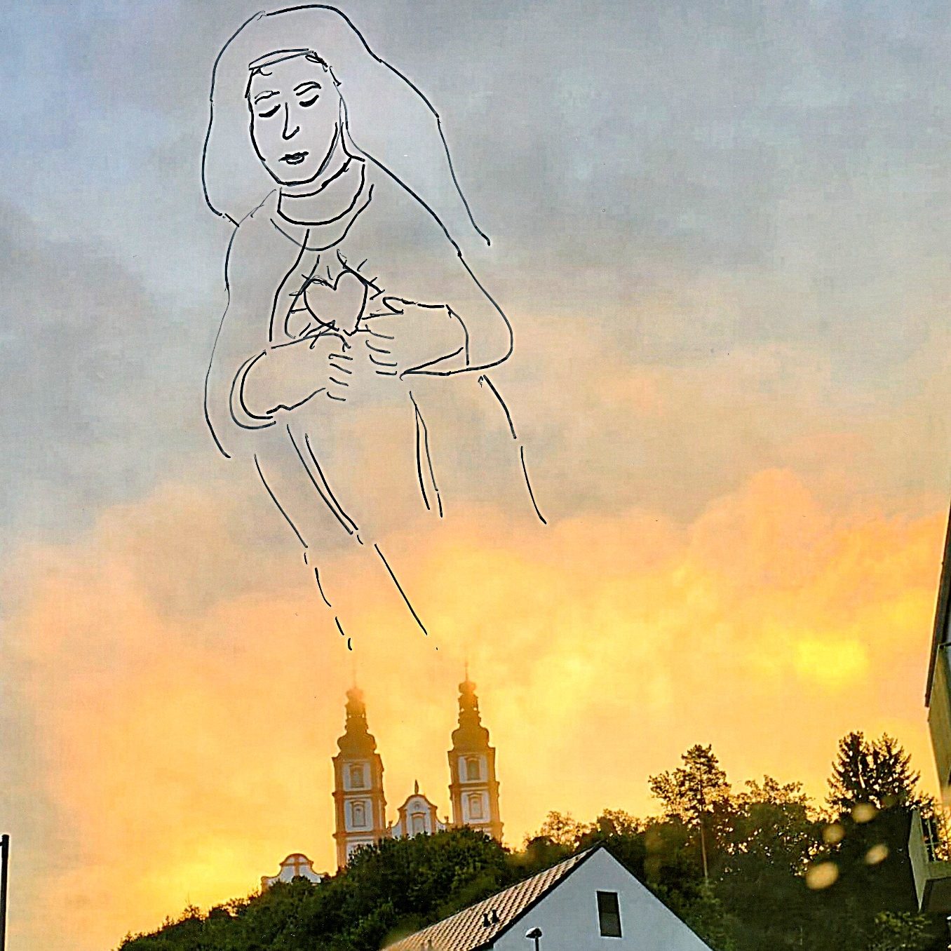 Looking very closely at the clouds, you can see a figure silhouetted against the background, hovering directly above the towers of the Maria Trost pilgrimage church ("Maria Trost" means: the comforting Mother of God). It is a woman wearing a white veil on her head. She is wearing a blue cloak. Underneath, she is wearing a white dress. Her gaze is lowered. Her arms are bent, and with both hands, the woman is pulling her cloak to the side, revealing her heart.